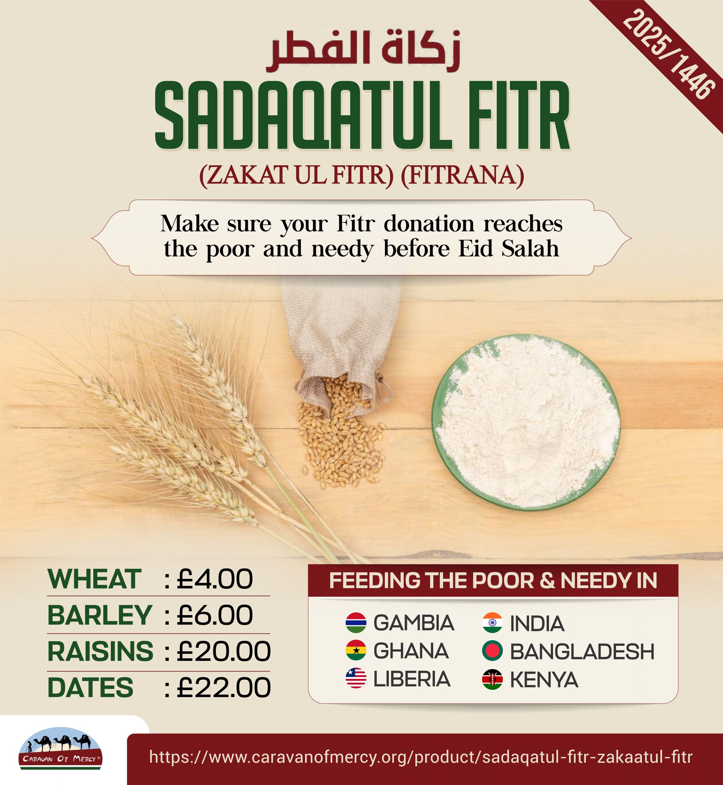 Sadaqatul Fitr, also known as Zakaatul Fitr, must be paid anytime before the end of Ramadhan (before the Eid prayer). According to Hadith (Abu Dawood), Sadaqatul Fitr as obligatory; it purifies the fasting person, and is a means of feeding the poor.