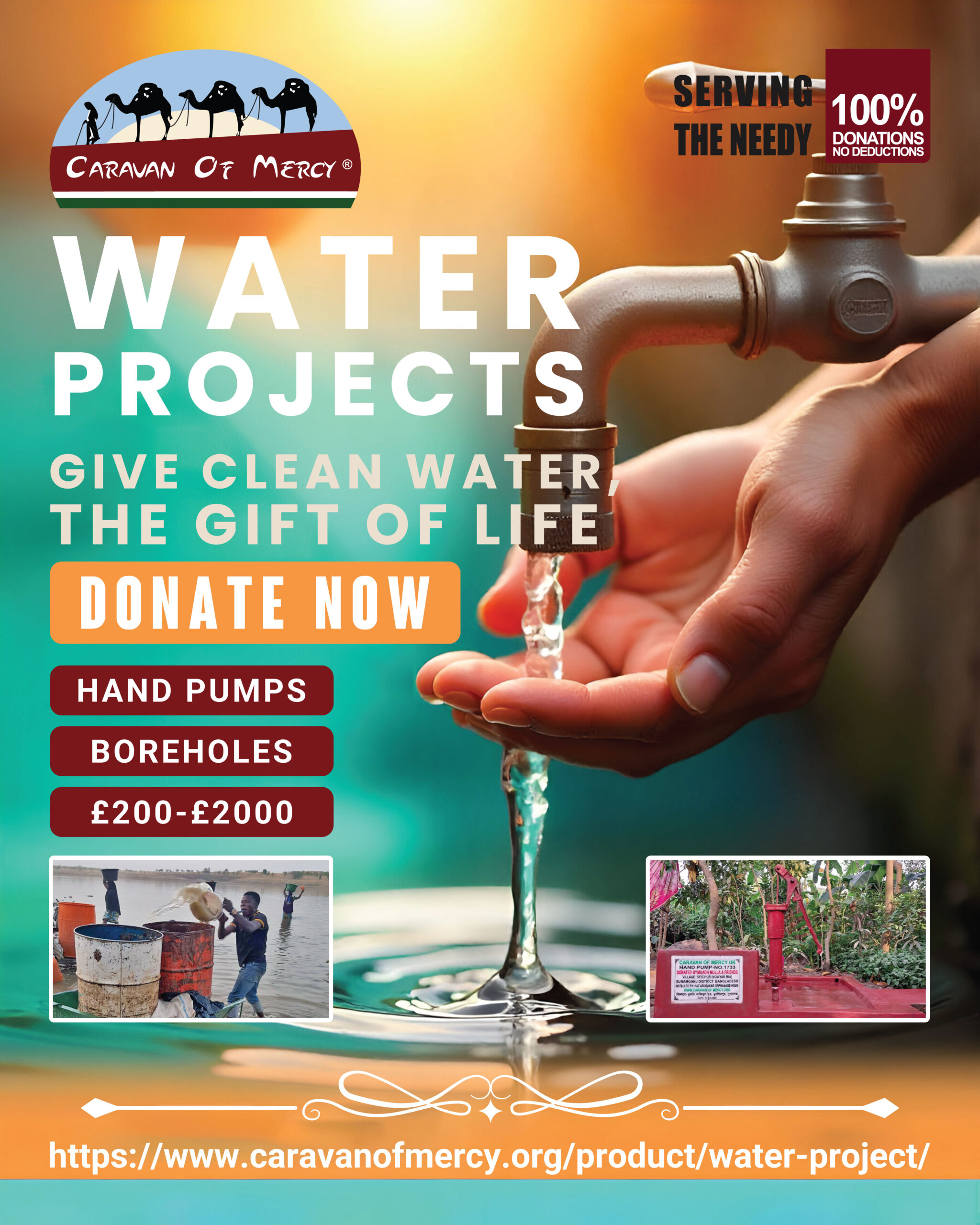 Caravan of Mercy aims to play an active part in trying to provide safe clean water around the world. We aim to achieve this by installing hand pumps and boreholes in those areas that are most in need. We are also looking to install a purification plant in Ghana.